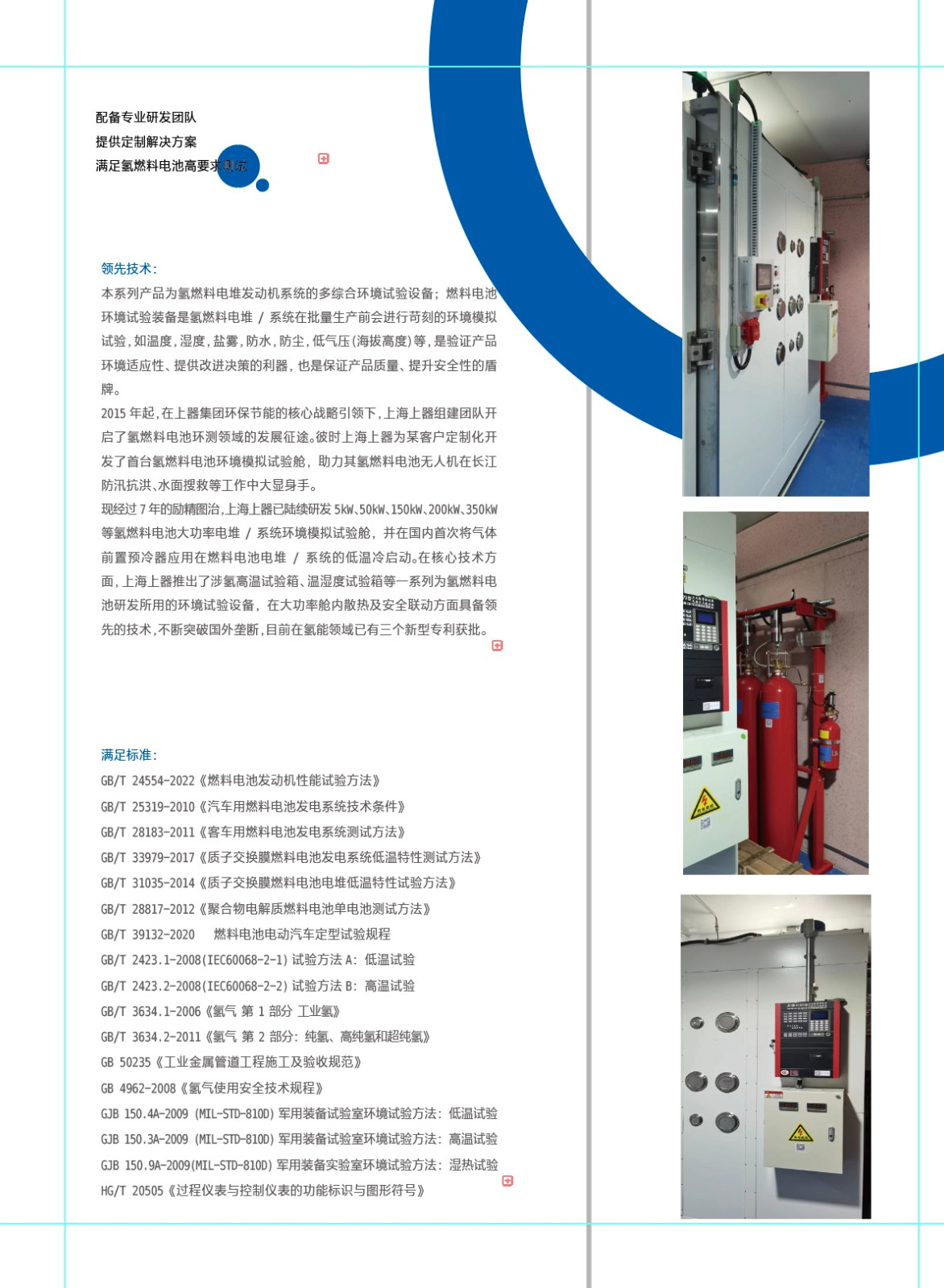 现经过7年的励精图治,上海上器已陆续研发5kW、50kW、150kW、200kW、350kW等氢燃料电池大功率电堆/系统环境模拟试验舱,并在国内首次将气体前置预冷器应用在燃料电池电堆/系统的低温冷启动。在核心技术方面,上海上器推出了涉氢高温试验箱、温湿度试验箱、高原模拟试验舱等一系列为氢燃料电池研发所用的环境试验设备,在大功率舱内散热及安全联动方面具备领先的技术,不断突破国外垄断,目前在氢能领域已有三个新型专利获批。